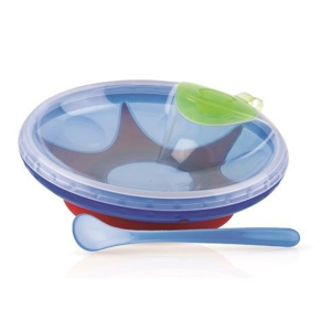 Nuby այս ափսեն կափարիչով  և երկար գդալով է, այն նաև  ջեռուցման համար է նախատեսված,  չի պարունակում  Bisfenol- A.