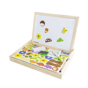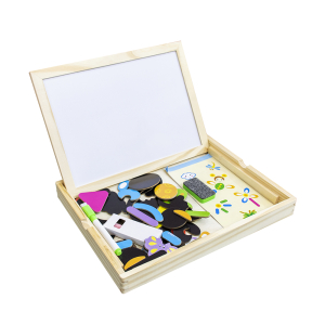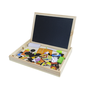 The box includes a double-sided wooden blackboard, marker, chalk, eraser մ magnetic puzzles